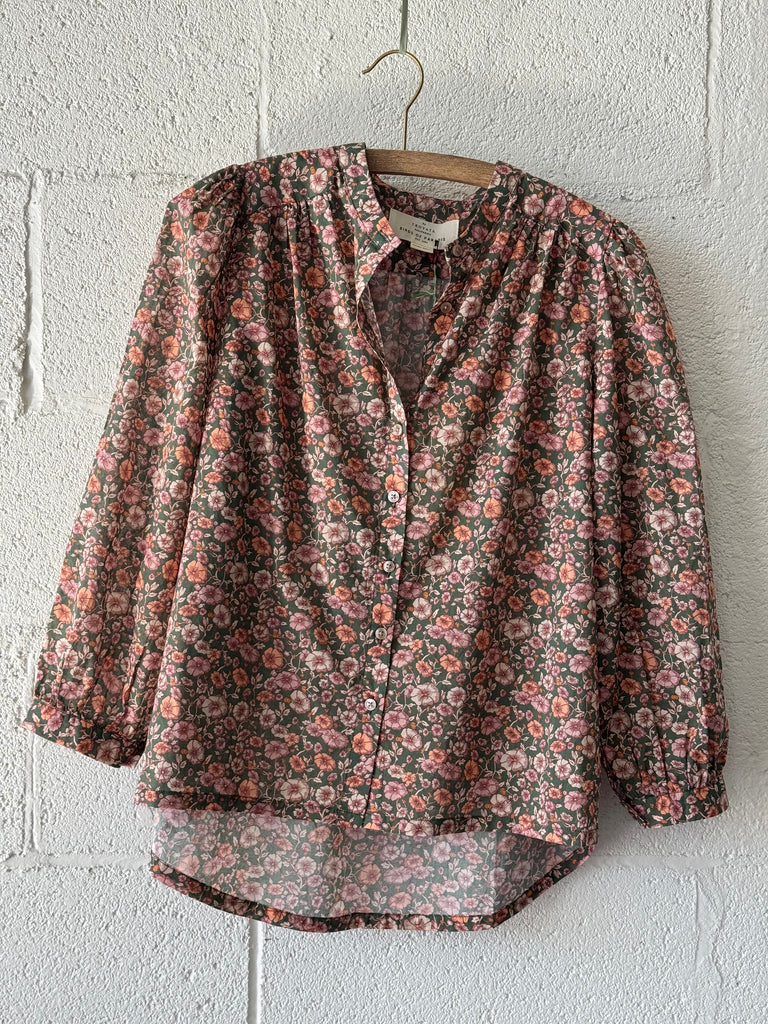 The Clara Blouse is a button-front blouse with billowy shoulder gathers, a clean standing collar and bracelet-length buttoned sleeves. Includes Trovata's signature back detail with a gathered waist tab. Made from Trovata's cotton voile.