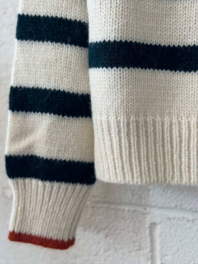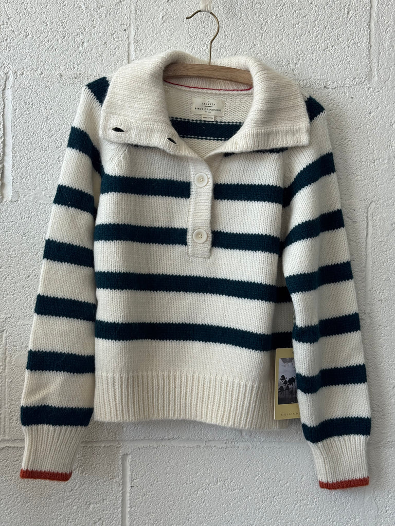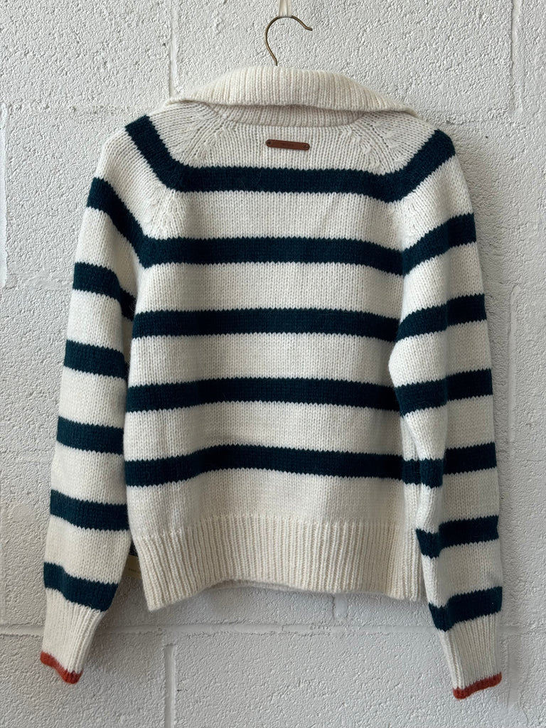 The Juneau Sweater is a polo style knit sweater with vintage cream buttons, standard body length and flexible ribbed cuffs, collar and bottom waist band. The Juneau Sweater offers warmth and classic alpine style for cool weather layering. Available in Teal Stripe and made from an alpaca wool blend.