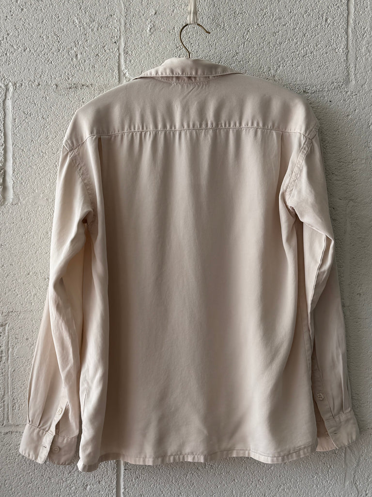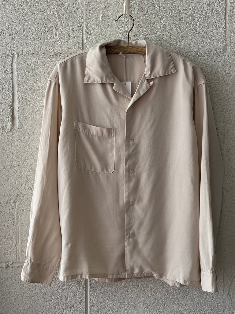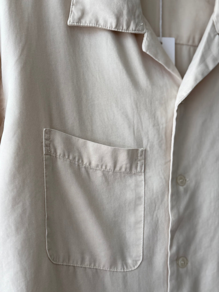 the melody top is crafted in soft, drapey tencel and reimagines the pajama shirt as an everyday piece. designed with a camp collar, full front buttons, and buttoned sleeves that can be worn rolled or long, it balances relaxed ease with a polished finish.