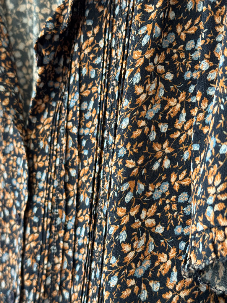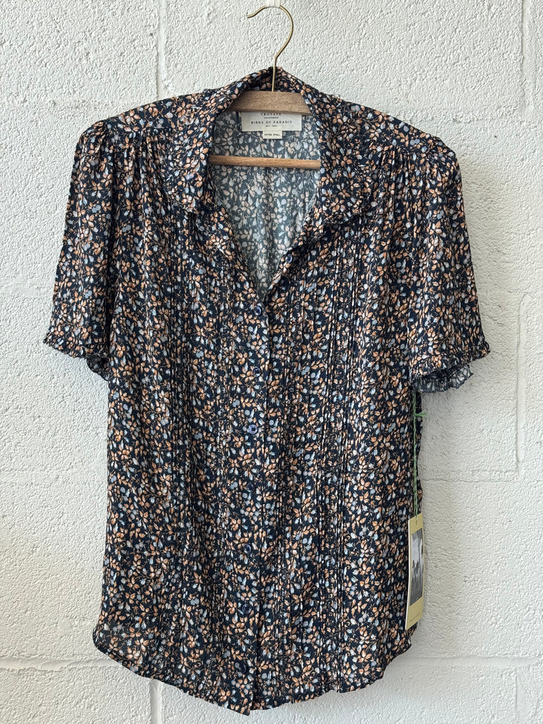 The Millie Blouse is a pintuck blouse with short sleeves, a rounded collar with small ruffled trim and a slim fit. Light weight and perfect for layering year-round. Available in Nightshadow Ditsy.