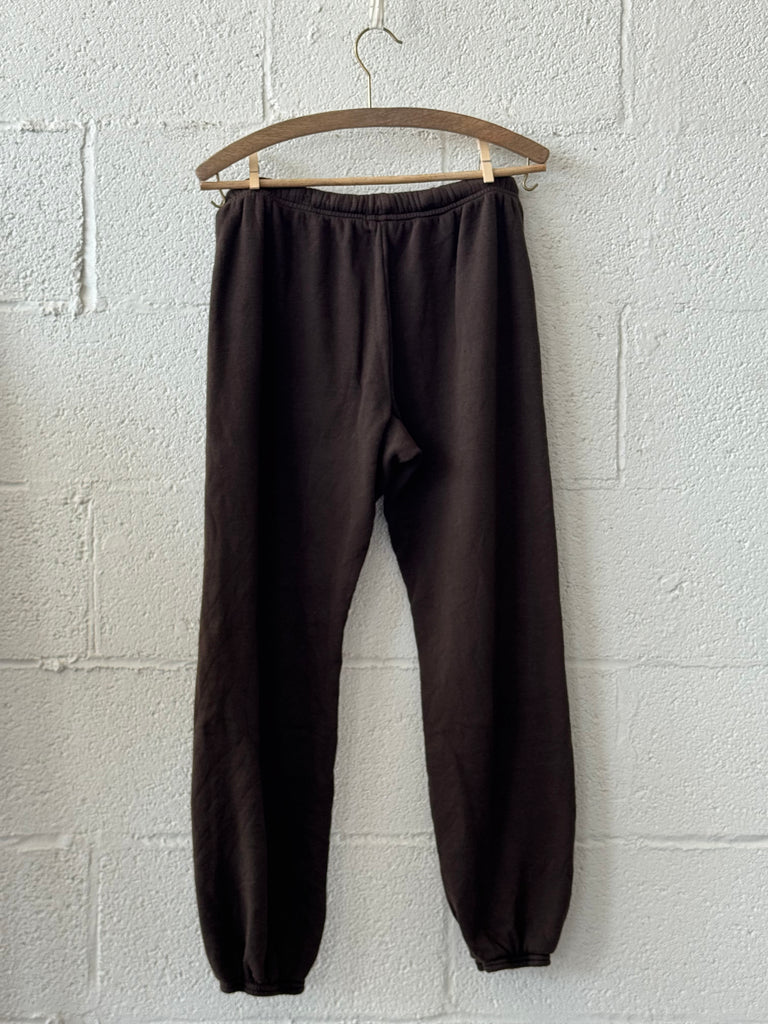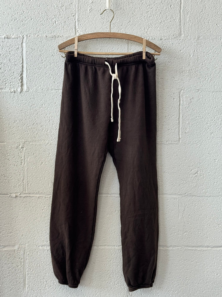 Hey Gang's sweatpants are super cute, slightly cropped, easy fit, with elastic waist band and twill tape drawstring. They do have a slight weight to them which makes them extra cozy, but not hot.