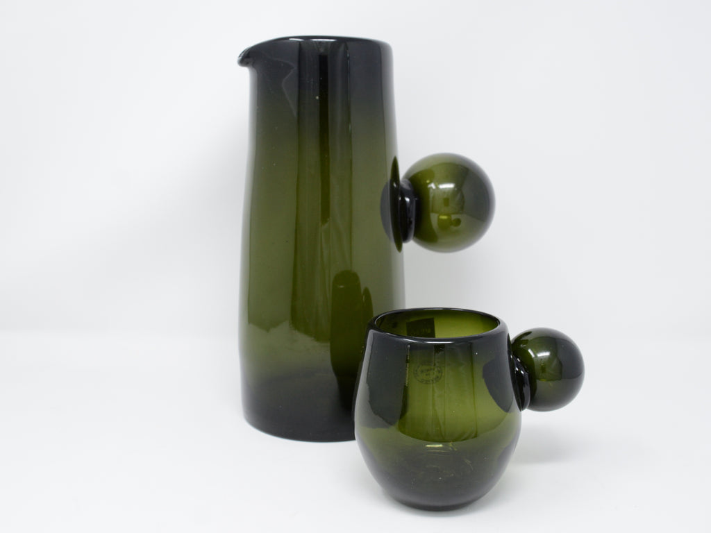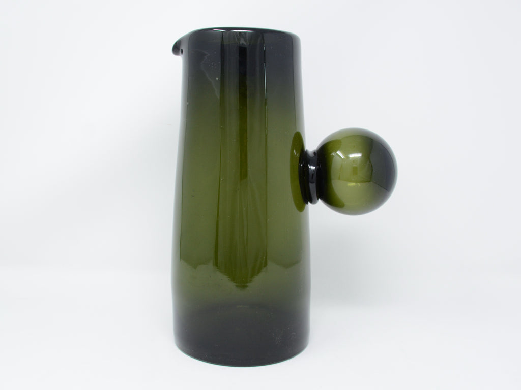 The Nina pitcher is made using recycled glass by artisans in Guadalajara, Mexico. Green color. Food Safe.