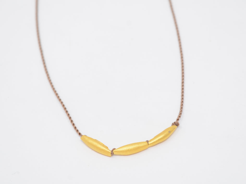 Handmade golden grains of rice in 24 karat gold over sterling silver, knotted taupe nylon. Carved flower button closure. 16"