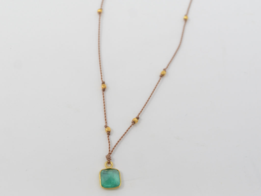 An emerald set in an 18k bezel on a nylon cord strung with 18k gold beads.