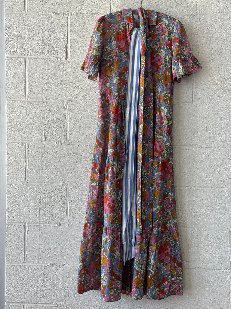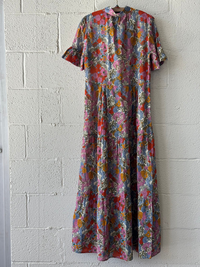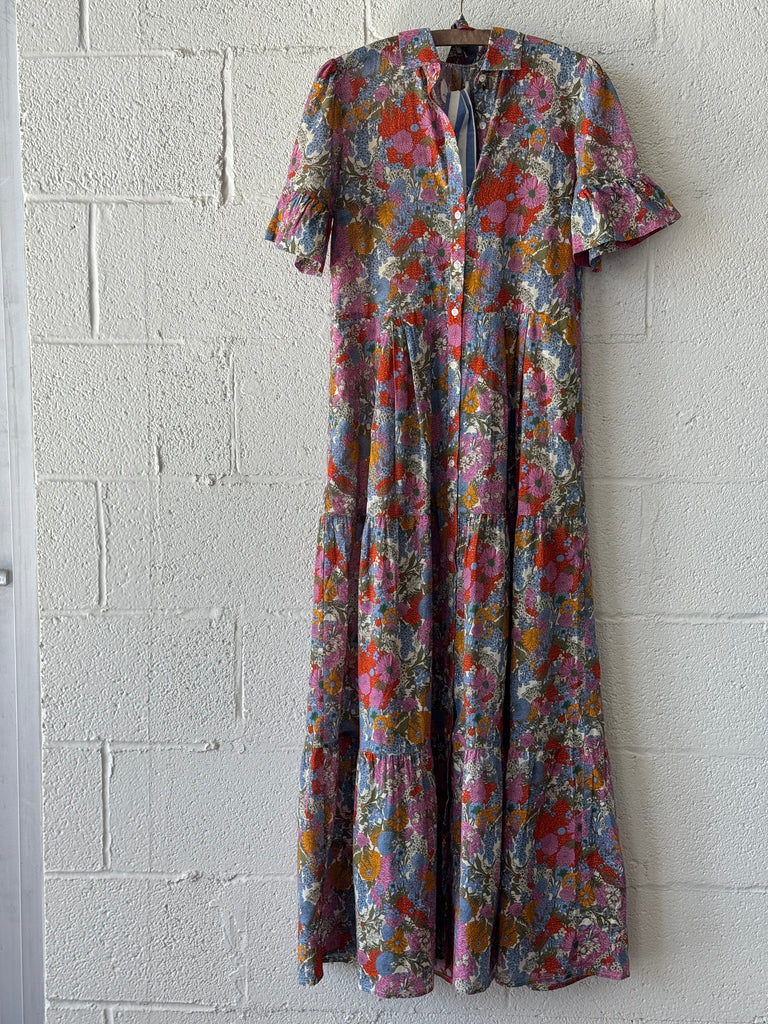 The Martine dress is long and flowing, reaching the ground. Long pleats from the waist give extra movement to the tiered skirt. Completed with antique white buttons and matching self-fabric sash. Available in Delicate Tilia and made from a cotton voile.