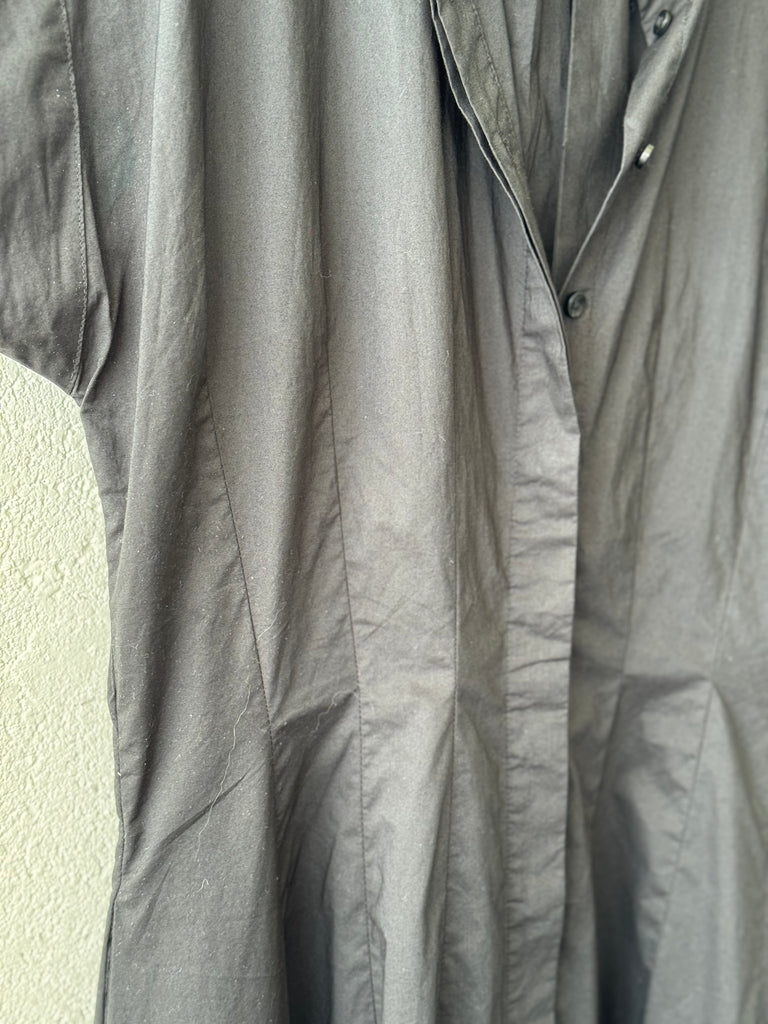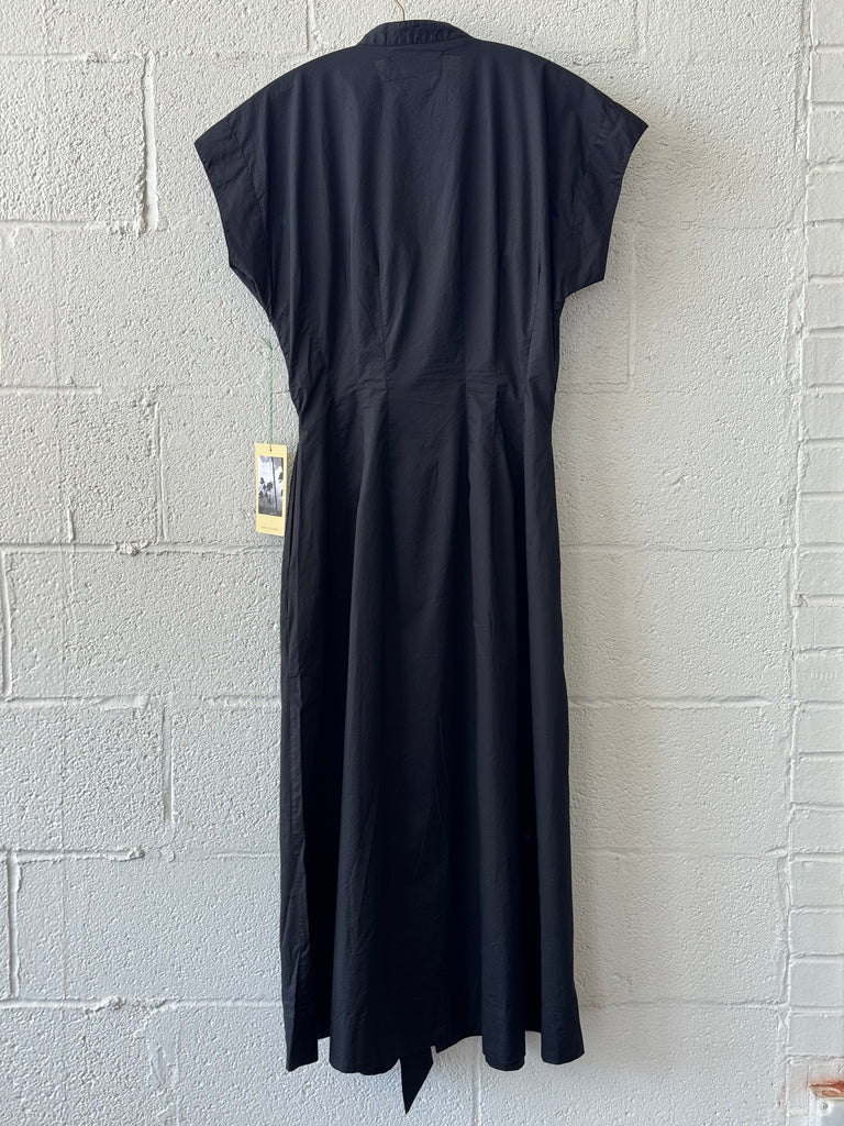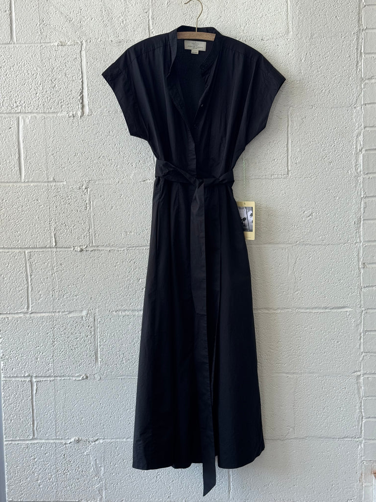 The James Dress is a clean, dolman-sleeved, midi shirt-dress. Front and back stitched waist darting and included waist sash provide a flattering silhouette. Featuring Trovata's signature side seam hip pockets, a narrow standing collar and a fully function front buttoned placket. Available in Black and made from a crisp cotton poplin.